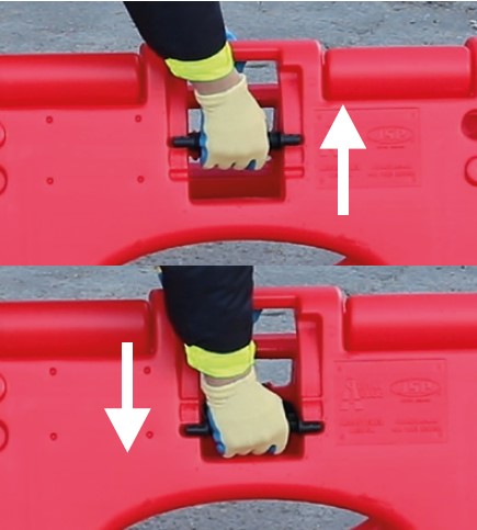 Stand over the barrier, take hold of the bracing lock and push down to separate the feet. Ensure bracing lock is pushed fully down into the lock position. After use , pull up on the bracing lock until the barrier has returned to the closed position.
